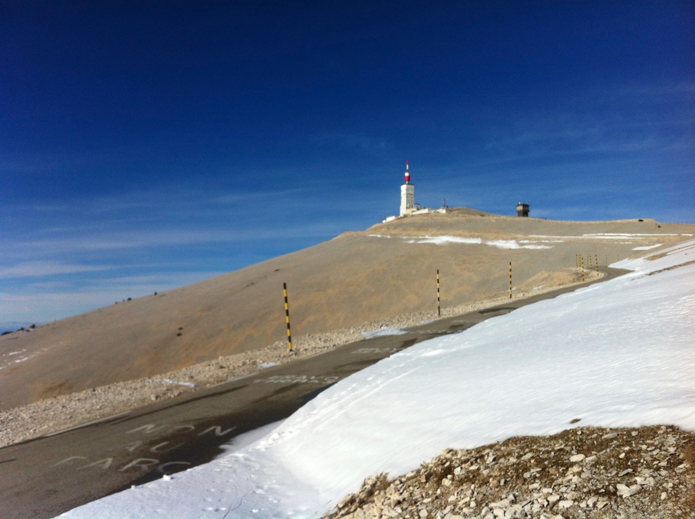 I was still feeling reasonably good right up to the final bend before the section on which the Simpson memorial stands. As I turned the bend I was exposed to the full force of the wind coming over the Col des Tempêtes and a gradient of 9%. It was too much. For the first time I started to doubt it if I could actually make it. The wind was ferocious and every turn of the pedals was a battle. I zig zagged across the road trying to dodge the gusts. And as i approached the memorial stone what confidence I had drained out of me buy the significance of the terrible event that occurred on the spot nearly 50 years previously.