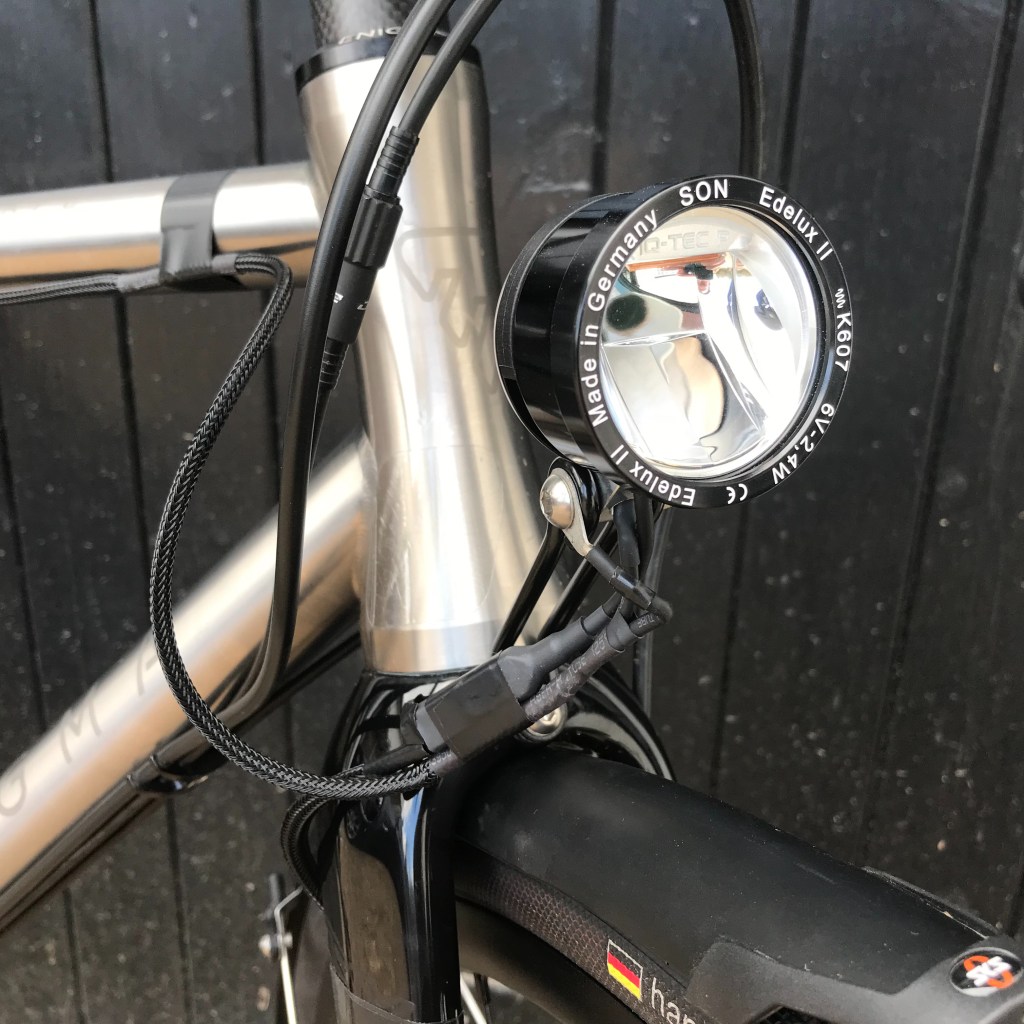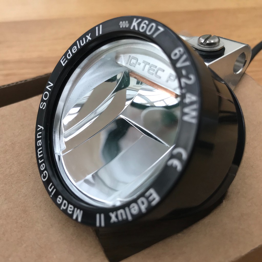 I was close to buying a Supernova E3 Pro but on advice settled for a SON Edelux II. This light has great optics, a good reputation amongst the Audax community and of course it keeps consistency with the dynamo. They also come in a range of different anodised aluminium finishes if thats your thing, I went for black. Did I say that already?