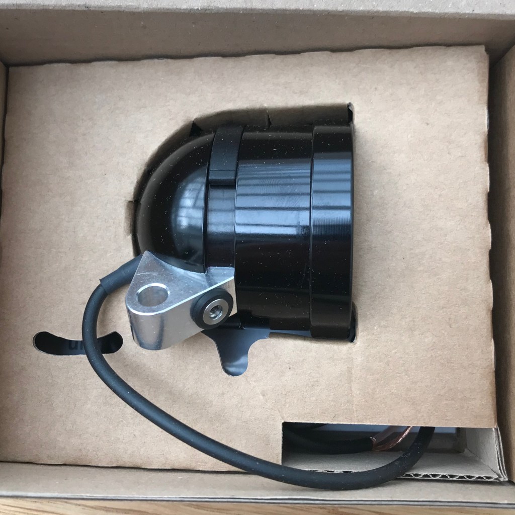 The front light arrives in a small, environmentally friendly cardboard box, with insulated terminals for the rear light. As you can see from these photos the optics throw a unique beam pattern on the road from the single LED which is mounted in the top of the light facing backwards.