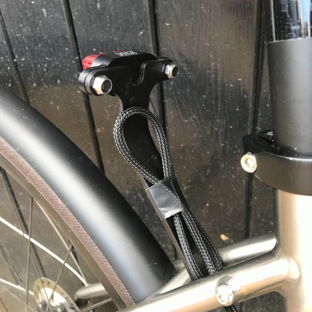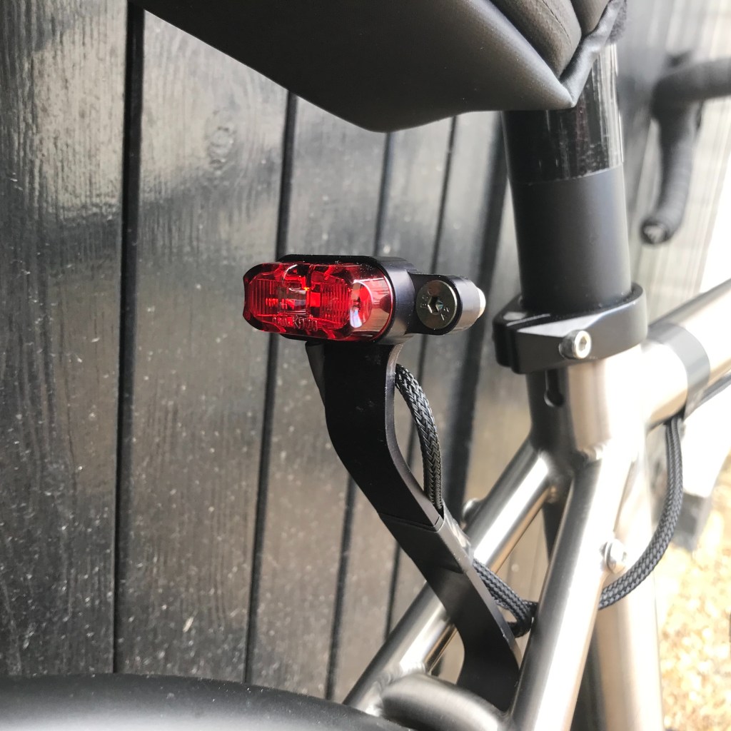 In my case I was not planning to have a rear rack so that would mean a seat post mount. However I was planning to have a large saddle bag for Audax riding and that would obscure a seat post mounted light. This left me with a but of a problem. After much, much searching on the internet I found this bracket from Framebuilder Supply in the US.